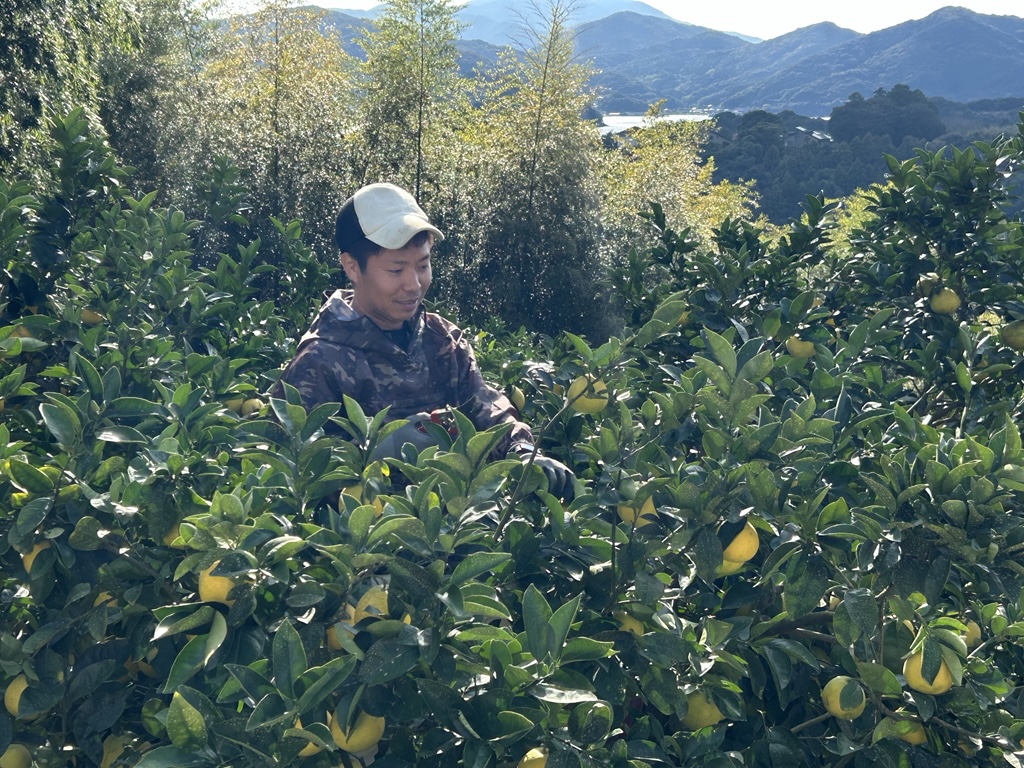 地域の方や外国人材を活用し、常時6名雇用しながら作業に当たります。それぞれ役割分担しながら、春から秋口にかけて防除や施肥、落下防止剤の散布を実施します。12月上旬のポンカンから3月頃の河内晩柑まで順次収穫作業に取り組みます。