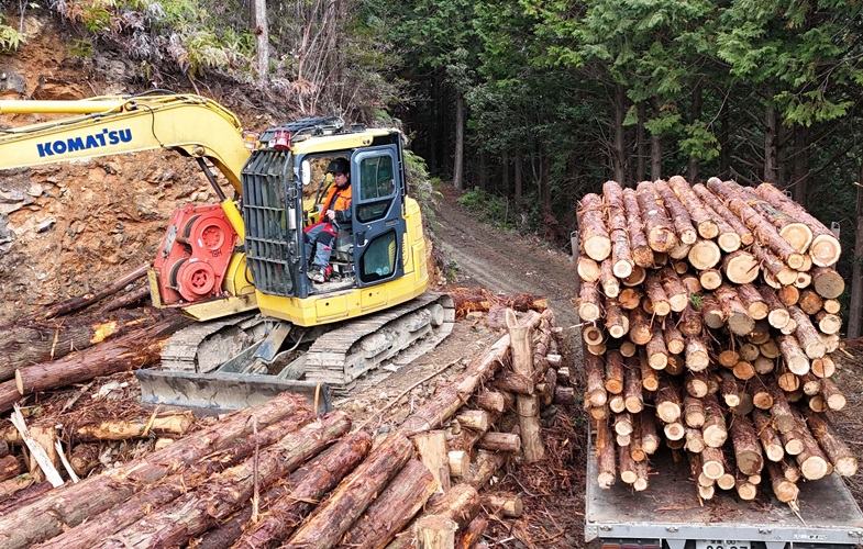 所有林約85haで林業経営を行いっています。また、森林整備 (間伐)の請負も年間50~60ha行っており、素材生産量は4,000㎥です。曾祖父の代に植林を始め、祖父が所有山林の森林整備や木材生産を行い、父が会社を立ち上げて所有山林のみならず地域内外の人から頼まれた山林の手入れなどを行っています。