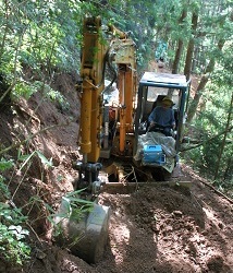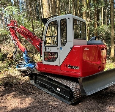 息子と2人で間伐を行っています。生産性と安全性の面から機械化は不可欠のため、林内路網密度300m/haを目安に作業路を開設しています。グラップルとウインチが付いた小型のバックホーや運材車の他に、プロセッサー、フォワーダ2台、6tのスウィングヤーダを使って効率化に努めています。